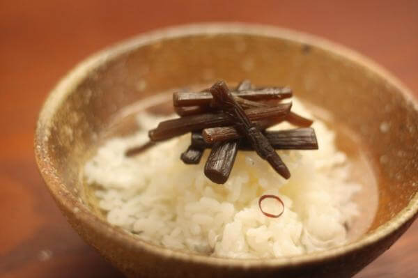 きゃらぶきの淡い調味料の味わいが、透明なお湯にしみこみ白米をつつみこみます。