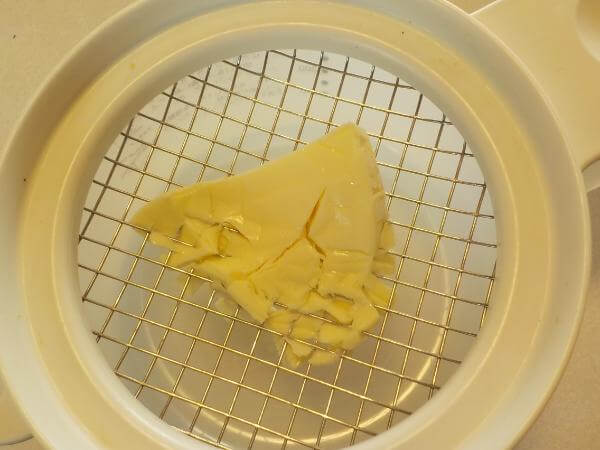 つぶれた白身が、金網にのこります。ていねいに下の透明な容器に落としてください。