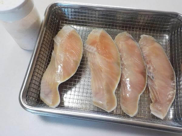 まずは、鮭に3パーセントほどの塩をふりかけ、鮭の水分と臭みをぬきましょう。