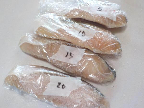 順番は前後しますが、できあがったぼだっこです。左から塩分濃度20%、15%、10%、5%です。
