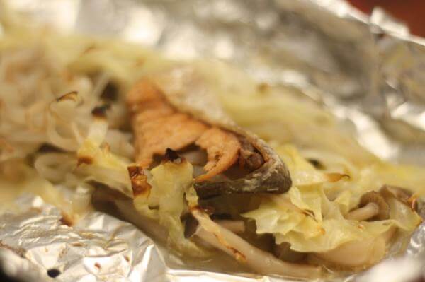 ぼだっこをいれ、たっぷりの野菜をいれ、さらに無塩ブターをひとくくわえてホイル焼きに。