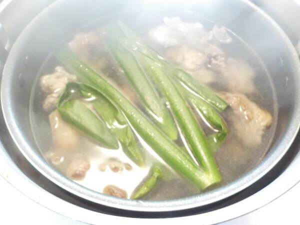 たっぷりのお湯を沸騰させ、焼いた牛すじを保温鍋のなかにいれます。