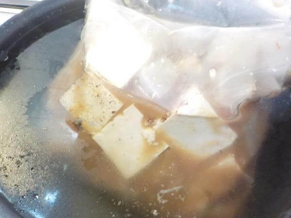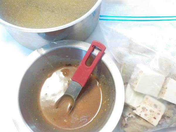 そのあとこんにゃくや豆腐、味噌などの調味料を牛すじを袋にいれ保温調理する。