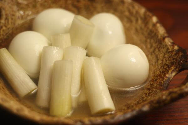 牛すじのスープとゆで卵、葱をビニール袋にいれ保温調理すれば、簡易おでんになります。