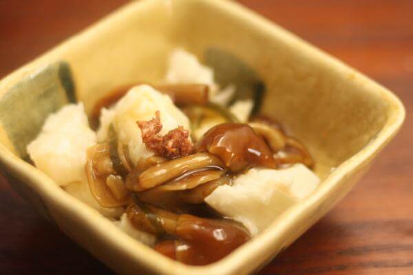 木綿でも絹でも、なめたけをのっけると、黄金色のあんをかけたように豆腐の口あたりがなめらかになります。