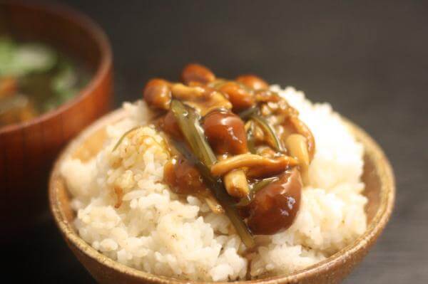 炊きたての白米になめたけをのっけると、なめたけの旨味のかさが大きくひろがります。