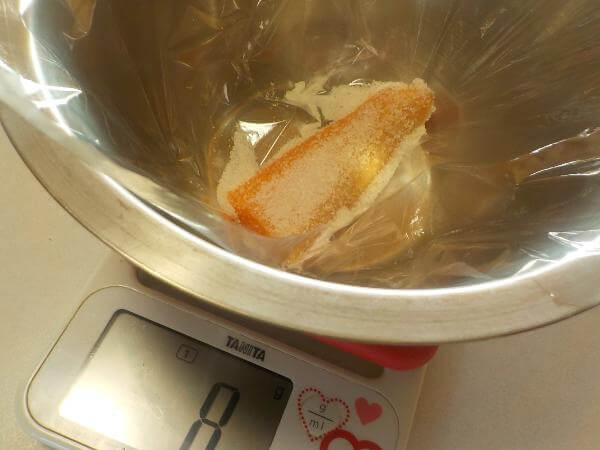 鮭のはらみの重量をはかります。そして、20%の塩をくわえました。