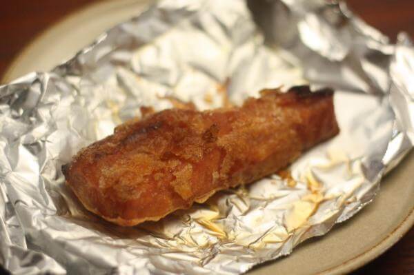 塩のコーティングのおかげで、鮭の果肉は焦げにくいです。