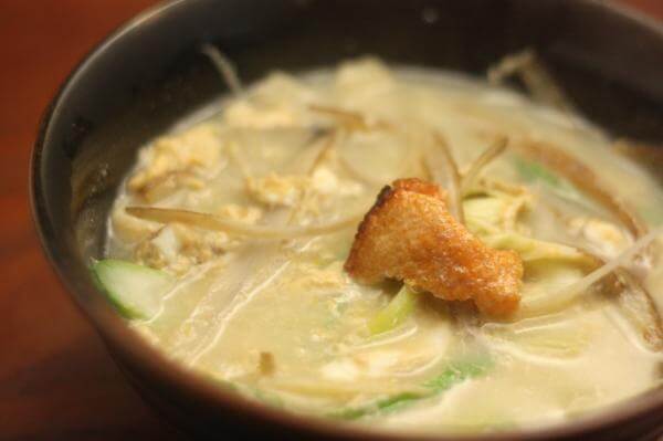 お湯に鮭のはらみのぼだっことごぼうと青ねぎをいれ煮たあとに、卵をかけまわしいれたもの。