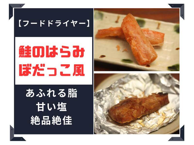 この記事は、鮭のはらみに塩をふりかけ、フードドライヤーを利用して作るぼだっこ風の作り方・レシピを紹介しています。