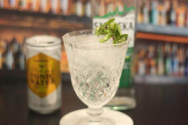ウォッカ マウンテン ビュー ハーブとトニックウォーターを氷をいれたグラスのなかで混ぜあわせました。