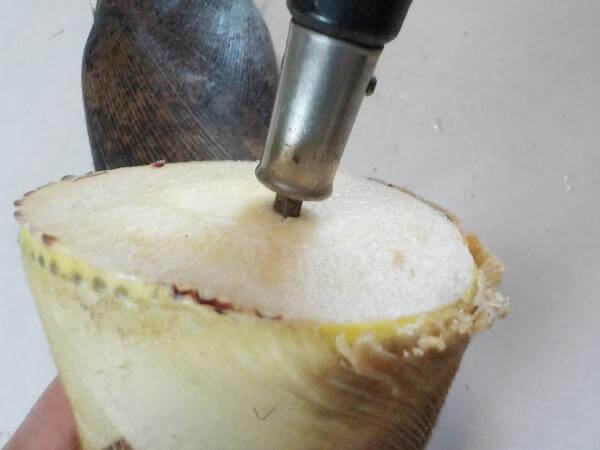 タケノコの先端を穴につっこんだほうが楽です。調味料が漏れないようにしっかりと先端をつっこみましょう。